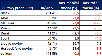 Na druhou stranu dále platí, že nejvýrazněji klesá deníkům pultový prodej – v září to bylo meziročně o 9 %. U deníků Blesk a Deník je meziroční snížení pultového prodeje na úrovni 10 %, v případě MF Dnes na úrovni necelých 13 %.