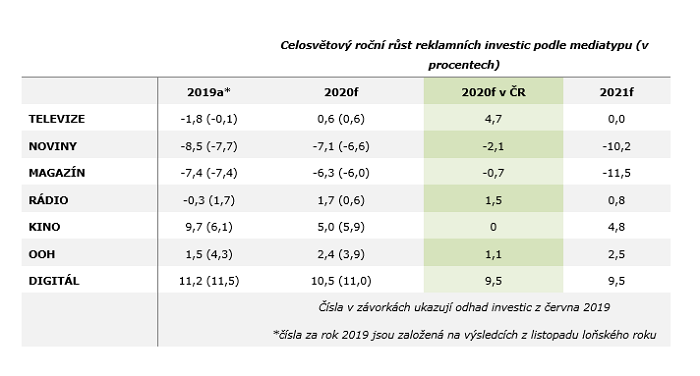 Z pohledu mediatypů půjde ve světě největší podíl mediálních rozpočtů do digitální reklamy, která s celkovými investicemi ve výši 6,2 bilionu korun pohltí 45,7 %. Nejvíce se na jejím růstu budou podílet sociální sítě, do nichž investice vzrostou o 10,5 %.