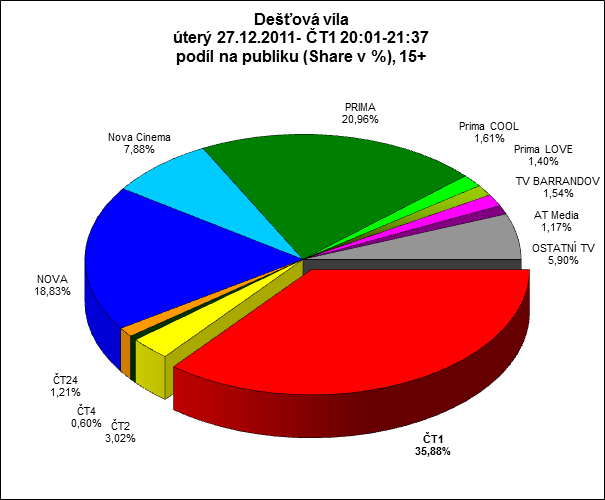 Premiéru pohádky Dešťová víla, kterou uvedla ČT1 v úterý 27. prosince od 20:00 hodin, sledovalo 1, 516 mil. diváků starších 15 let (share 35,88 %) a také 140 tisíc dětí (sledovanost 13,6 %, podíl na publiku 40,86 %). Stala se tak nejúspěšnějším pořadem sledovaným v tomto čase na všech televizních stanicích.