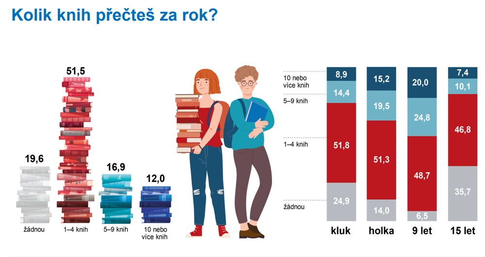 Vedle vysoké online aktivity výzkum poukazuje i na výrazný pokles čtenářských návyků. Žádnou knihu za poslední rok nepřečetla přibližně pětina dětí, u chlapců dokonce čtvrtina. Ve skupině patnáctiletých nepřečetla za rok žádnou knihu už třetina respondentů. Naopak více než deset knih ročně přečetlo 12 % dětí, především v nejmladší věkové kategorii devítiletých, kde tento podíl dosahuje pětiny.