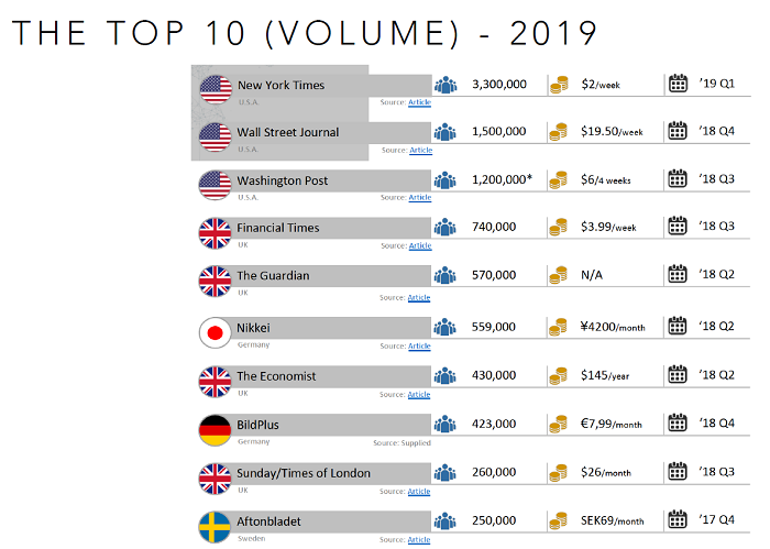 Nejvíc digitálních předplatitelů má podle studie deník New York Times – konkrétně 3,3 mil. předplatitelů. Následují Wall Street Journal a Washington Post, které mají více než milion digitálních předplatitelů (1,5 mil., resp. 1,2 mil.). V přehledu níže je také uvedena průměrná cena předplatného a časový údaj, ke kterému se data vztahují. Jak z přehledu vyplývá, nejvíce z prodeje digitálních předplatných získává Wall Street Journal. Přestože má méně předplatitelů než New York Times, jeho prodejní cena je výrazně vyšší. Roční obrat WSJ z prodeje digitálního předplatného je už 1,5 mld. USD (cca 34,5 mld. Kč), což je pětkrát víc než v případě New York Times.
