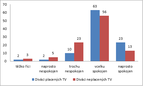 Celkově je 86 % diváků placených televizí spokojeno s televizní nabídkou. To je o 17 procentních bodů více než u diváků neplacených televizí. Zároveň je u placených TV pouze 12 % nespokojených diváků. U diváků neplacených TV je nespokojeno 28 % jejich diváků.