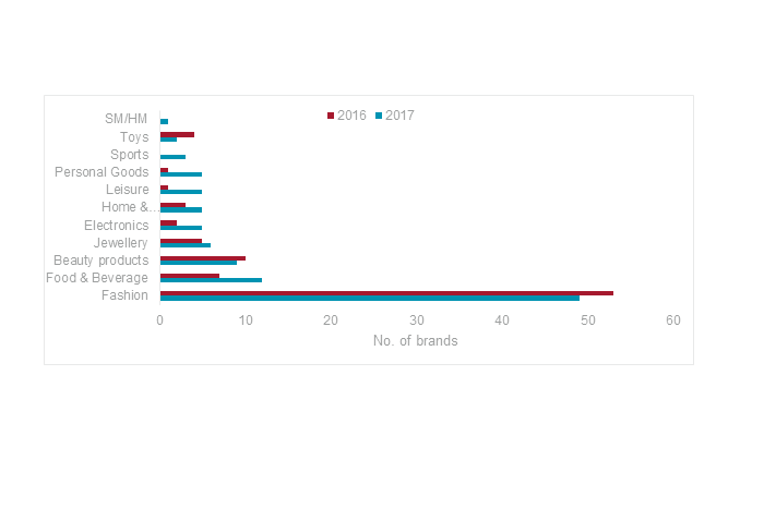 Nejvíce expandují obchody s módou, v roce 2017 se v průměru podílely na 46 % všech nově příchozích do zemí střední Evropy. V Česku a Rusku dosahovaly až 55 %. Mezi ty nejzajímavější patřily Palmers (Praha, Budapešť), Karl Lagerfeld (Praha), Superdry (Slovensko), L.K.Bennett (Rusko) či vstup české značky Alpine Pro do Polska. Z hlediska cílení zákazníka co se módy týče, převládaly značky zaměřené na masový trh s 58 %, druhou příčku obsadily značky prémiové tvořící 39 %.