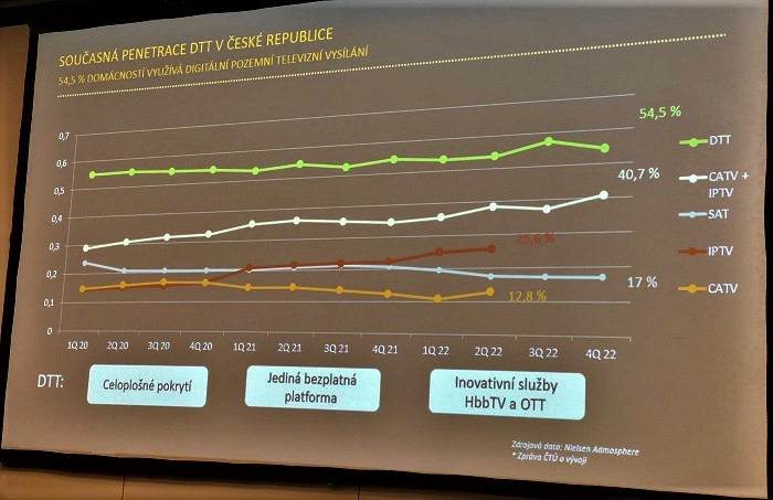 Penetrace pozemního vysílání (DTT) zůstává podle Miloše Mastníka dlouhodobě na úrovni 54 % domácností. Jde o nejsilnější distribuční platformu v Česku. Společný podíl IPTV a kabelové TV dosahuje 40,7 % a jejich podíl se zvyšuje. Podíl satelitu mírně klesl na 17 %. „Trh si vybral, jaký je ten správný směr. Celé je o symbióze pozemního vysílání a IP. Symbióza je životaschopná a dává smysl. Máme přibližně milion čtyři sta tisíc připojených televizorů k internetu,“ uvedl Mastník, podle kterého je pozemní vysílání zároveň nejodolnější platformou proti případných kyberútokům. „U pozemního vysílání by znamenalo pro ochromení infrastruktury zlikvidovat 26 hlavních vysílačů a okolo 40 dokrývačů.“