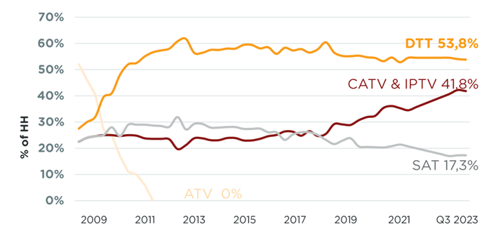 Digitální terestrika (DTT) stále zůstává nejrozšířenějším způsobem příjmu televizního signálu v České republice a dlouhodobě se pohybuje na úrovni 53,8 %. Rostoucími platformami pro příjem TV vysílání jsou IPTV a kabelová televize se souhrnným podílem 41,8 %. Data se vztahují ke třetímu čtvrtletí 2023 a vycházejí z oficiálního měření ATO-Nielsen. Zároveň pokračuje pokles satelitního vysílání.