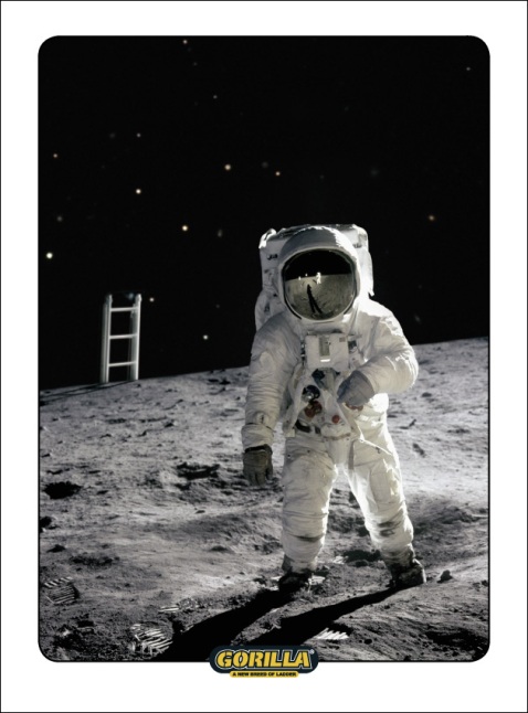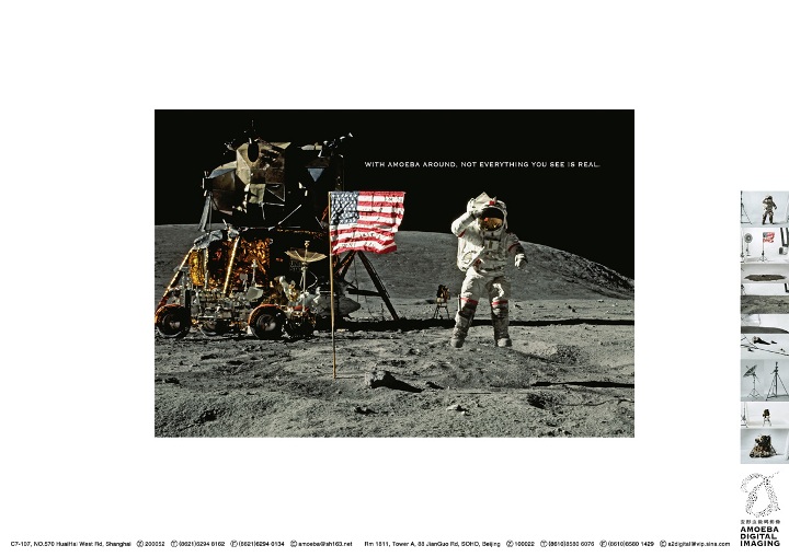 Dále si reklama ráda hraje s motivem zfalšovaného přistání na Měsíci. Zcela se nabízí pro grafická studia či fotografy. Grafické studio Amoeba to dokazuje sloganem: „V blízkosti Amoeby, ne vše, co vidíte, je skutečné." (With Amoeba around, not everything you see is real.)