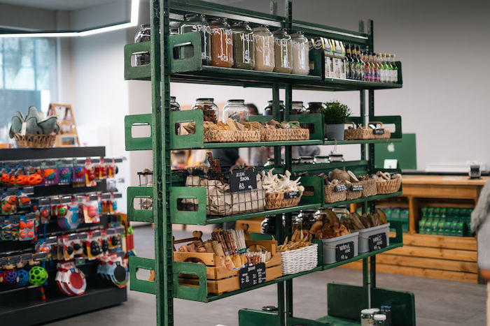 Prodejna v Říčanech nabízí celý sortiment, na který jsou zvyklí zákazníci v Holešovicích. Je to krmivo převážně od českých dodavatelů, ale také například hračky, oblečení a další vybavení pro psy z přírodních a recyklovaných materiálů. Zákazníci mohou vybrané krmivo, pamlsky a doplňky výživy nakupovat také na váhu, klidně i do vlastních obalů.