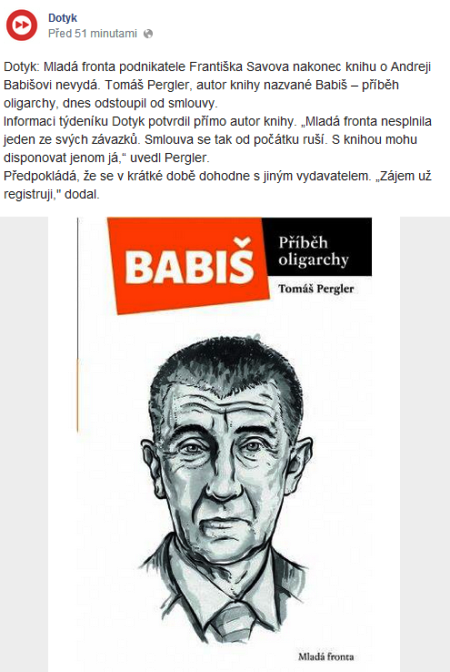 Vydavatelství Mladá Fronta Františka Savova nakonec knihu o Andreji Babišovi nevydá. Jak informoval tabletový týdeník Dotyk prostřednictvím svého FB profilu, autor knihy Tomáš Pergler ve středu odstoupil od smlouvy.