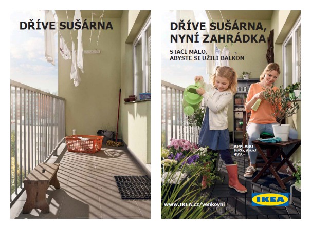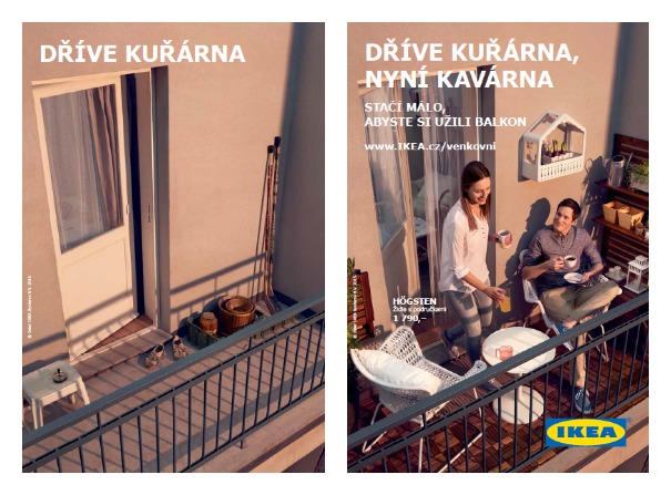 Dubnová kampaň společnosti IKEA se zaměřuje na balkóny. V outdooru a na internetu ukazuje, jak lze pomocí jednoduchých řešení přeměnit balkón na místo pro trávení hezkého času, aniž by ztratil ze své praktické funkčnosti. Z kuřárny se rázem stává kavárna, ze sušárny zahrádka.