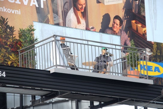 Balkón jako místo odpočinku představuje také atypickou nástavbou na bigboardu. Před naschvál nedodělanou plochou na balkóně odpočívají dvě figuríny.