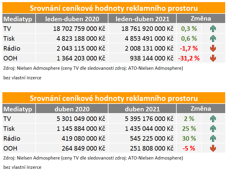 Objem monitorovaných reklamních investic v médiích v letošním dubnu byl o sedm procent vyšší než v loňském stejném měsíci. V meziročním srovnání se odrazil slabší loňský duben, proto je letošní výsledek u tištěných médií a rádií o 25 %, resp. o 30 % vyšší. Úroveň z loňského dubna si udržela televizní reklama (+2 %). Naopak mírně pod loňským dubnem zůstaly monitorované investice ve venkovní reklamě.