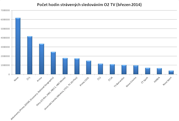 V počtu hodin, které strávili diváci O2 TV v březnu před televizními obrazovkami, vedla s celkovým počtem 6,2 milionu hodin Nova. O třetinu nižší sledovanost vykázala ČT1 a o téměř polovinu níže se umístila Prima. Čtvrtou příčku potom obsadila Prima Cool. Zájem mezi diváky budí i dokumentární kanály (Prima Zoom, National Geographic, Discovery), které se na celkové březnové sledovanosti O2 TV podílí téměř osmi procenty.