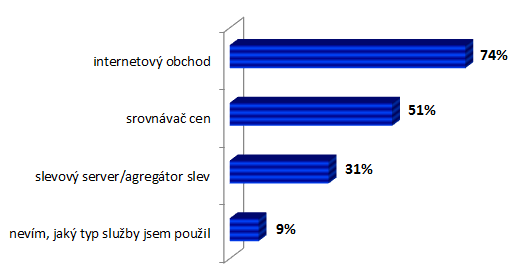 Čeští uživatelé nakupují online nejčastěji v e-shopech, které použily už tři čtvrtiny respondentů. Více než polovina uživatelů někdy vyzkoušela srovnávač cen a téměř třetina slevový portál.