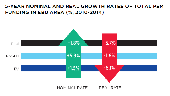 Celkový příjem evropských médií veřejné služby byl v roce 2014 jen o 2 % vyšší než v předešlém roce. V pětiletém pohledu vývoje příjmů médií veřejné služby mluví organizace spíš o stagnaci. Upozorňuje na to, že celkový vývoj v roce 2014 neznamená, že ve všech zemích se příjmy médií veřejné služby zvýšily. Naopak, ve 13 zemích zaostaly za rokem 2013, a dokonce v 19 zemích byly výnosy médií veřejné služby v roce 2014 nižší než v roce 2010. Pokud by se zohlednila i výše inflace, byl by výsledek pro evropská média veřejné služby mezi lety 2010 a 2014 celkově nižší o téměř 6 %.