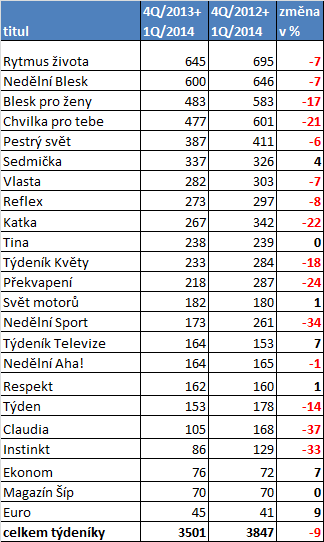 Zdroj: Media projekt, IVQ/2013+1Q/2014, Unie vydavatelů. Median, STEM/MARK