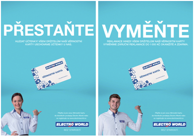 Společnost Electro World v nové komunikační kampani představuje výhody, které přináší věrnostní karta v oblasti nakupování, reklamací a papírové administrativy. „Při rozhodování, které služby v rámci věrností karty zákazníkům nabízet, jsme vyslyšeli požadavky samotných zákazníků, nechali jsme se inspirovat v zahraničí i našimi vlastními prodejci“, uvedl Emil Huraj, marketingový ředitel ze společnosti Electro World.