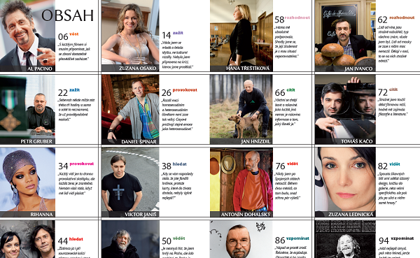 V nabídce prvního čísla čtenáři najdou rozhovory s překladatelem Viktorem Janišem, Markem a Terezou Brodskými či s kreslířem Vladimírem Renčínem. Magazín Interview vychází poprvé 5. března 2015 v rozsahu 100 stran a stojí 35 Kč.