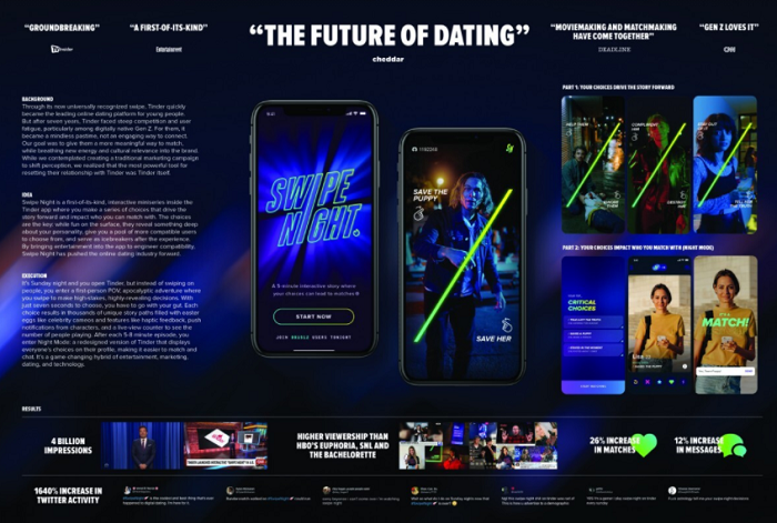 V digitální kategorii získala Grand Prix kampaň Swipe Night pro Tinder od agentury 72andSunny Los Angeles.