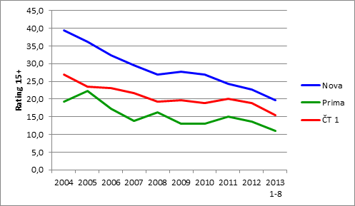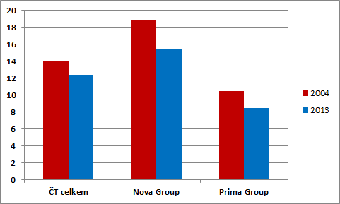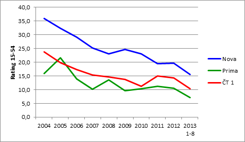 Během deseti let se ale televizní prostředí podstatně proměnilo. TV kanálů je několikanásobně víc, diváci disponují lepší televizní technikou, na mediální konzumaci mají značný vliv nová média. Televizní stanice už nestaví na jednom kanálu, ale skládají svoji sledovanost z většího počtu většinou tematických stanic. Protože celková televizní sledovanost v Česku neklesá (naopak v posledním roce roste), štěpí se pozornost televizních příjemců mezi násobně širší televizní nabídku. Nejsilnější televizní skupiny se tak snaží své podíly udržovat pomocí nových kanálů, aby nepřišly o své publikum. Jak je patrné z následujícího grafu, třem nejsilnějším TV skupinám, jejichž sledovanost dnes tvoří v případě ČT šest kanálů, v případě Nova Group pět kanálů a v případě Prima Group čtyři kanály, se v souhrnu průměrné ratingy v čase vysílání od 20:00 do 22:00 za posledních deset let snižují mnohem méně než v případě jejich hlavních kanálů - snížení je v tomto čase vysílání na úrovni 2-3 ratingových bodů. Jinými slovy: alespoň k přibližnému výsledku, kterého před desti lety dosáhly s jedním kanálem, dnes potřebují kanálů několik...