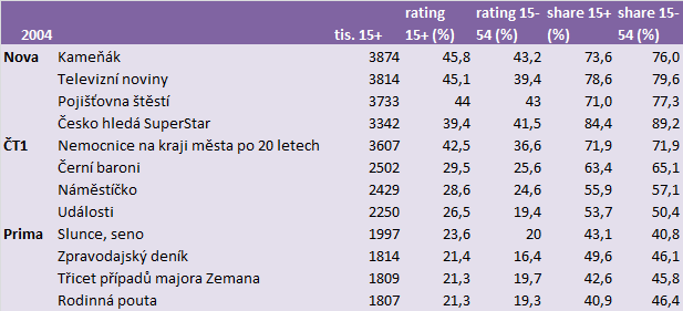 Je Nový rok 2004, osm hodin večer a Češi usedají k televizím, jde přece Kameňák. Pořad ten den dosahuje rating 45,8 %, což je 3,874 mil. diváků (15+) a podíl na sledovanosti 73,56 %. Za celý rok 2004 už Kameňák nenašel přemožitele. Nikdo to sice ještě netuší, ale blíží se nová éra a fenomény jako jsou rostoucí počet TV kanálů, rostoucí penetrace internetu a finanční krize.