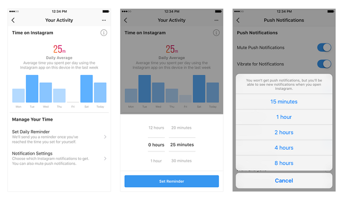 Nové funkce se nalézají v nastavení obou aplikací. Hlavní částí je ovládací panel, který ukazuje průměrný čas strávený v aplikaci na konkrétním zařízení. Dále je možné zobrazit si celkový čas v rámci daného dne a nastavit si časový limit spolu s denním upozorněním při jeho překročení. Upozornění na aktivitu stránek a přátel lze nově ztlumit přímo v nastavení aplikací.