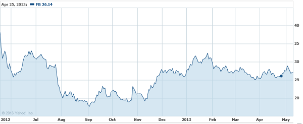 Znovu Facebooku pomohly finanční výkazy v květnu, kdy došlo k zveřejnění výsledků za 1. čtvrtletí roku 2013. Opět svými tržbami překonal odhady analytiků z Wall Street. Akcie společnosti na to zareagovaly růstem o dvě procenta. Zatímco v roce 2012 na jaře firma vykazovala čistý zisk 205 milionů dolarů, nyní to je 219, v přepočtu 9 centů na jednu akcii. Tržby vzrostly dokonce o 38 procent na 1,46 miliardy dolarů, očekávalo se o 0,02 miliardy méně. Důležitou položkou pro investory jsou příjmy z reklamy a jejich vývoj, protože právě na nich Facebook stojí. Ty vzrostly o 43 procent ve srovnání s minulým rokem. V současné době se tedy hodnota akcií pohybuje na necelých 27 korunách. Podle analytiků to je stále znakem značné nedůvěry investorů, situace je ale podstatně lepší, než byla minulý rok.