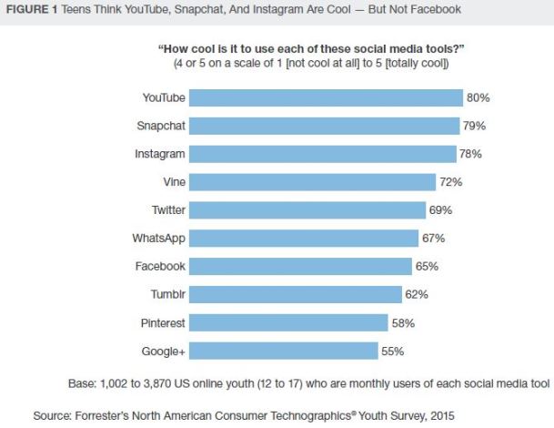Analytici Forresteru přišli se zjištěním, že pouze 65 procent amerických online uživatelů ve věku 12 - 17 let označilo Facebook jako atraktivní (cool) sociální síť. To je výrazně méně než YouTube (80 %), Snapchat (79 %), Instagram (78 %), Vine (72 %) nebo Twitter (69 %). Ještě za Facebookem skončily v tomto ohledu Tumblr, Pinterest a z 55 procenty Google+.