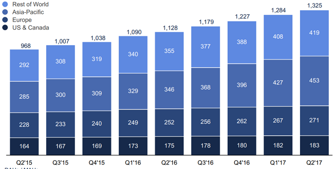 Počet denních i měsíčních aktivních uživatelů roste srovnatelným tempem, a to na úrovni 17 % ve srovnání se stejným obdobím loni. Ve druhém čtvrtletí, resp. v červnu 2017, registroval Facebook 1,03 mld. aktivních denních uživatelů. Počet měsíčních aktivních uživatelů překročil 2 miliardy (2,01 mld.).