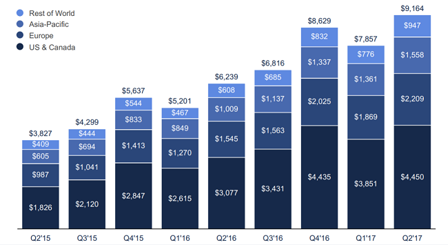 Výnosy největší sociální světové sítě Facebook ve druhém čtvrtletí 2017 meziročně vzrostly o 45 % a dosáhly 9,3 mld. USD. Výnosy jsou téměř výhradně generovány z reklamy (9,16 mld. USD). Tahounem je potom mobilní reklama, která se na výnosech ve druhém čtvrtletí podílela z 87 %. Čistý zisk se vyšplhal na 3,9 mld. USD, což meziročně znamená navýšení o 71 %.