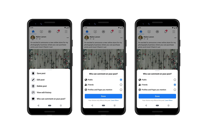 Facebook zavádí nový nástroj, díky kterému budou moci uživatelé u zveřejněných příspěvků omezit okruh osob, které je komentují, a to díky výběru z nabídky od možnosti „každý, kdo může vidět daný příspěvek” až po možnost zpřístupnit příspěvek uživatelům a stránkám, které v příspěvku označili. Veřejně známá osobnost, tvůrce obsahu nebo značka může rovněž omezit svůj okruh uživatelů, kteří komentují jejich veřejné příspěvky.