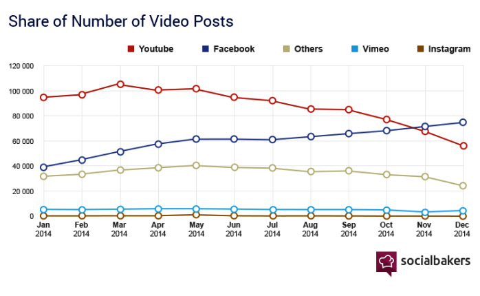 Marketéři volí videoformát Facebooku jako první možnost ke zveřejnění videa, přičemž tento trend dále roste. Poprvé Facebook YouTube těsně předehnal již v listopadu, v prosinci však svůj náskok výrazně navýšil: na Facebooku značky publikovaly o 20 tisíc videí více než na YouTube. Ještě před rokem přitom byla v tomto ohledu sociální síť YouTube jasně dominantním hráčem.