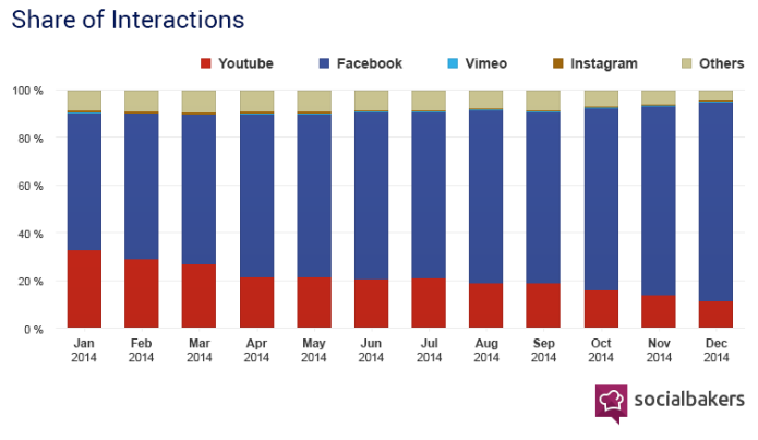 Co se počtu interakcí s videem týče, již před rokem byl Facebook jedničkou s více než polovinou všech interakcí. V prosinci loňského roku jich měl již 80 %.
