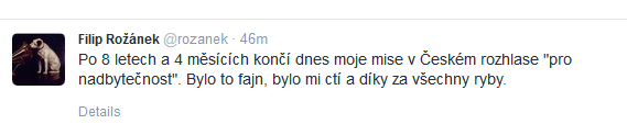 Analytik strategického rozvoje Českého rozhlasu (ČRo) Filip Rožánek končí po osmi letech v této veřejnoprávní instituci. Oznámil to v pátek na sociální síti twitter. Uvedl, že končí "pro nadbytečnost".