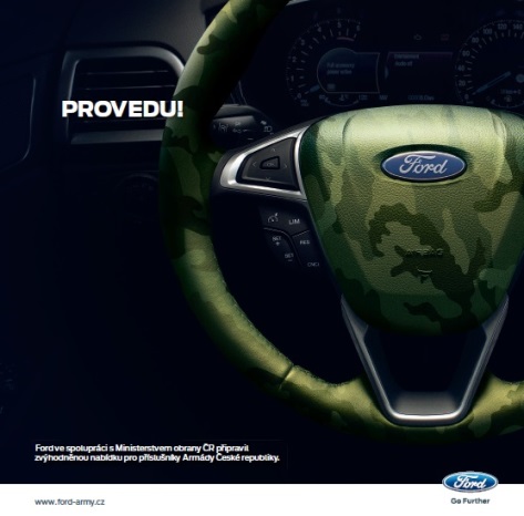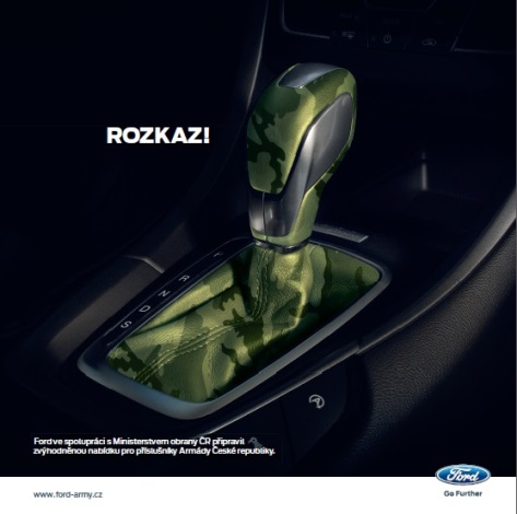 Klíčové vizuály v maskáčových barvách, které využívají až vojenské stručnosti, jsou k vidění na stránkách www.ford-army.cz, na bannerech i u dealerů vozů Ford, pro které jsou připraveny propagační materiály včetně welcome packu, plakátů roll-upů a dalších podkladů.