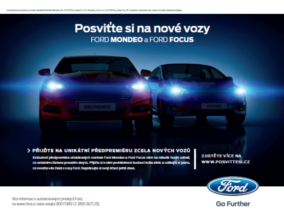 Automobilka Ford zve na předpremiéru novinek Ford Mondeo a Ford Focus, která bude probíhat v rámci celorepublikové roadshow. Roadshow bude probíhat ve vybraných dealerstvích Ford od 30. září do 6. listopadu a zahrnuje více než 30 českých a moravských měst. Internetová registrace probíhá na www.posvittesi.cz. Nové modely budou v nabídce dealerství koncem listopadu.