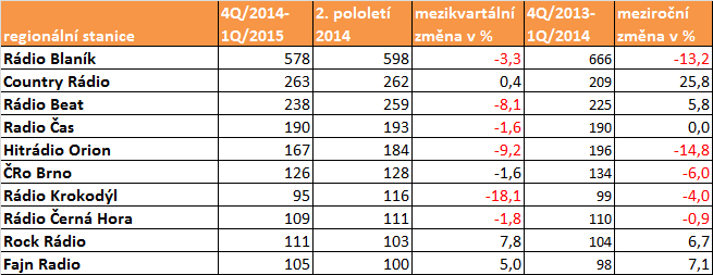 Nejposlouchanějším regionálním rádiem je nadále Rádio Blaník. Také lídrovi regionálního trhu denní poslechovost mírně klesla. V meziročním srovnání se nejlépe z nejsilnějších rádií vedlo Country Rádiu, v mezikvartálním srovnání zůstal jeho výsledek neměnný.