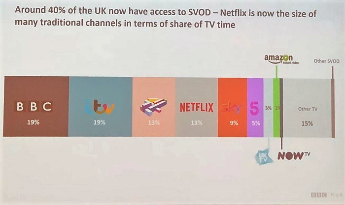 Zdá se tak, že tuzemský televizní vývoj je zatím odlišnější od některých zemí v západní Evropě. Jak na konferenci doložil Nick North z britské BBC, v Británii je zejména u mladších diváckých skupin patrný odklon od lineárního vysílání a na druhé straně je evidován nárůst času, který tato generace tráví se službami na vyžádání (nelineární služby). Výsledkem ale je, že před televizní obrazovkou tráví stejně času, liší se ale formy sledování. Proto se v současnosti mluví o rozhodujícím postavení velké obrazovky. Mladou generaci je možné k televizní obrazovce přitáhnout, pokud jim vysílatelé nabídnou „správný” obsah. Ve srovnání s Českem je také v Británii velmi využívaný přístup k placeným online službám (SVOD), kde má podstatnou roli Netflix. V míře času stráveného dosahuje dokonce čas věnovaný sledování Netflixu srovnatelných hodnot, jaké vykazují tradiční britské televizní stanice. Přesto si Nick North nemyslí, že by měli čeští televizní vysílatelé zůstat v klidu. „Není tady sice tak konkurenční prostředí, ale byla by chyba tvářit se, že se nic nemění. Mladí lidé mění své chování významně. Využijte své výhody a uvažujte o tom, jak transformovat své vysílání, abyste zůstali silní,“ vzkázal.
