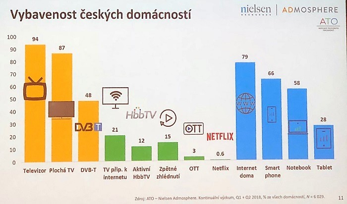 Zajímavý je také pohled na vybavenost zařízení ke sledování video obsahu v českých domácnostech. Televizní obrazovku najdeme v 94 % českých domácností, televizi připojenou k internetu v 21 % či aktivní HbbTV v 12 %. Přístup k platformě Netflix deklaruje pouze 0,6 % českých domácností.