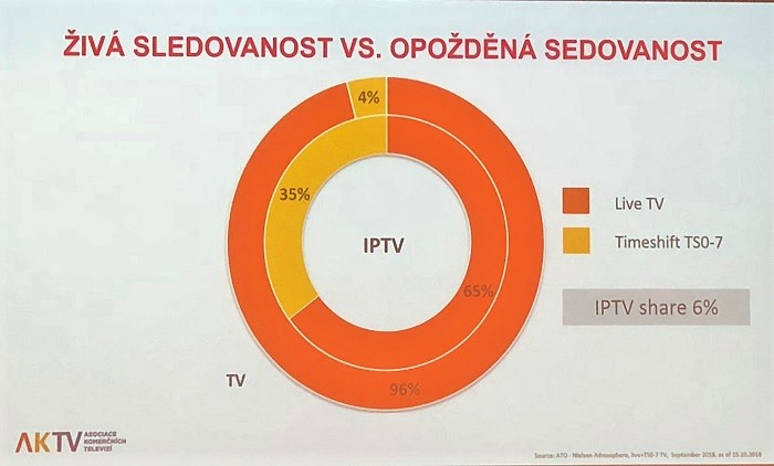 Živá televizní sledovanost (lineární vysílání) zůstává v českém prostředí stále rozhodujícím způsobem sledování televize, ukazují data, která na konferenci Future of TV v minulém týdnu představil Tomáš Hanzák z výzkumné agentury Nielsen Admosphere. Podíl živého TV sledování představuje v české populaci 96 % celkové televizní sledovanosti. Odložená sledovanost (time shift, tj. sledování v jiném čase, než ve kterém se pořad vysílá) tvořila průměrně v prvním letošním čtvrtletí 4 % (platí pro diváckou skupinu 4+). V mladší divácké skupině 15-44, kde lze předpokládat větší příklon k odložené sledovanosti, představovala více než 6 %. Odloženou sledovanost využívají více než zmíněný 4% průměr vedle mladších diváků také diváci s VŠ vzděláním a z vyšších socioekonomických skupin AB.