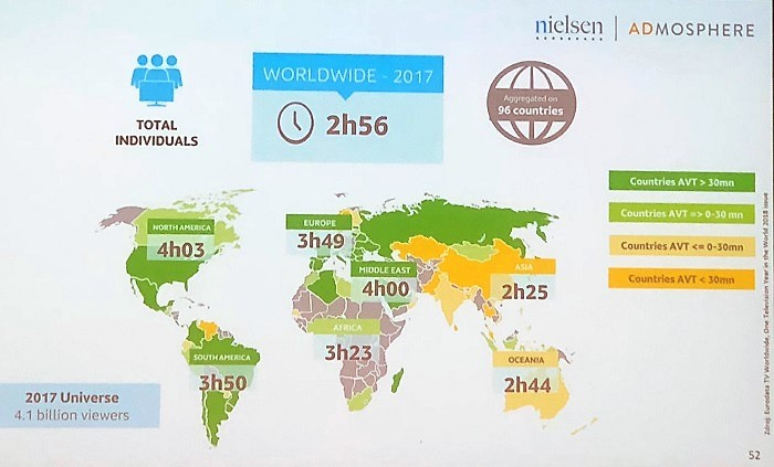 Ředitelka výzkumné agentury Nielsen Admosphere Tereza Šimečková doplnila, že placené video služby na vyžádání (SVOD) nevyužívá v Česku 98 % domácností. A ani mediální multitasking není zatím výrazným trendem v českých domácnostech. Při sledování televize bere mobil do ruky 28 % diváků, zmínila dále. Lineární televizní sledování představuje v průměru 3:45 hodin denně, a přestože u mladších je čas trávený sledování televize nižší, je stále podstatný – představuje 1:14 hodin denně u mladých ve věku 15-24 let a 2:27 hodin u diváků 25-34 let.