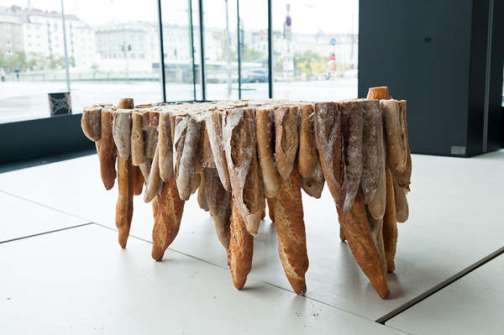 Na protest vůči mrhání potravinami se postavilo designové Studio Rygalik se svým stolkem z tvrdých baget. Vídeň, Rakousko