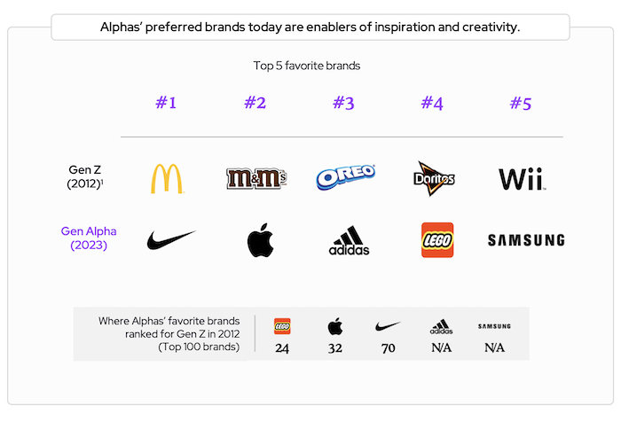 Oblibě se u generace alfa těší zejména technologické společnosti a značky, které jsou inspirativní a podporují kreativitu. V čele stojí Nike, Apple, Adidas, Lego nebo Samsung – pro srovnání u generace Z vedly v průzkumu z roku 2012 značky jako McDonald’s, M&M’s, Oreo, Doritos a Wii.