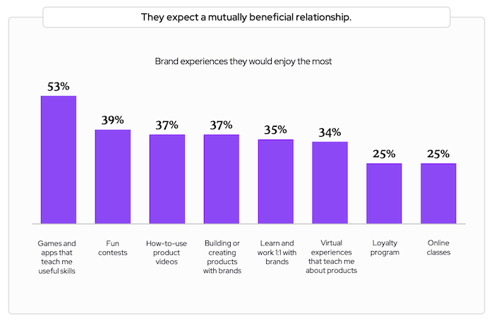 Prim u generace alfa hrají také videa s různými radami, návody či DIY nápady. Až 86 % by uvítalo, kdyby jim jejich oblíbené značky pomáhaly dozvědět se více o více, které je zajímají, a 81 % má rádo značky, díky nimž se cítí být součástí komunity. Od značek alfisté očekávají oboustranně výhodný vztah. Ocenili by hry a aplikace, které je naučí užitečné dovednosti (53 %), zábavné soutěže (39 %) či návody (37 %).