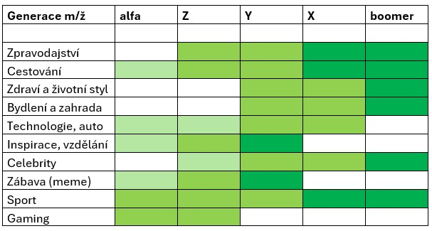 Studie ukazuje, že zatímco generace X a baby boomers stále částečně zůstávají u tradičních obsahových webů a předplatného, mladší generace Y a zejména Z se stále více přesouvají na sociální sítě a YouTube. Pro generaci alfa už textové weby mají menší význam, protože jejich vstupním bodem do médií jsou audiovizuální platformy.