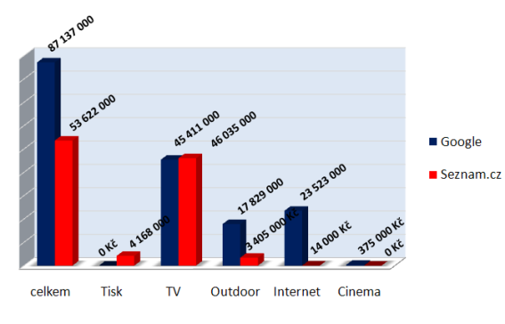 Obě firmy zahájily na začátku letošního roku marketingovou ofenzivu. Zatímco Seznam.cz vedl komunikaci přes ostatní mediatypy než internet, Google internetové komunikace využil. Právě větší využití internetové reklamy a větší zapojení outdoorových nosičů je hlavním důvodem, proč jsou celkové hrubé reklamní investice Googlu vyšší.