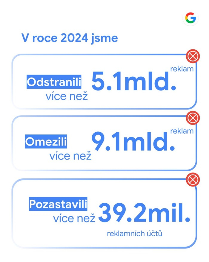 Společnost Google dále oznámila, že v roce 2024 zablokovala nebo odstranila 415 milionů reklam a pozastavila přes 5 milionů účtů inzerentů za porušování zásad týkajících se podvodných praktik.