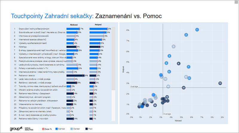 Významným tématem této části jsou také tzv. „Media Touchpoints“, kde zkoumáme, který zdroj informací (touchpoint) byl pro respondenta klíčový při nákupu produktu. Tato data nám pak vstupují mj. do našich strategických plánovacích nástrojů, čímž se mPanel stává integrální součástí tvorby komunikačních strategií.