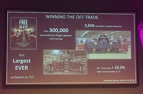 Poslední pilíř se zaměřil na podporu prodeje a spustil aktivaci v on trade i off trade. Guinness byl na čepu ve více než 10 tisících hospodách, na prodejnách vsadil na mohutné druhotné vystavení i promo dárky v podobě speciálních ragbyových sklenic.