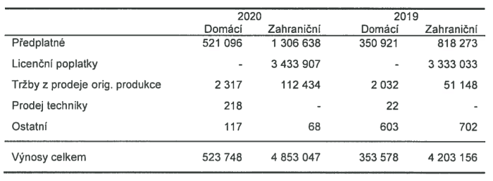 Z rozpisu výnosů vyplývá, že výnosy z předplatného rychle rostou. Na tuzemském trhu loni tvořily 521 mil. Kč a meziročně se navýšily o 48 procent. Také předplatné ze zahraničních trhů rostlo v pandemickém roce 2020 výrazně – zvýšilo se o 60 % na 1,3 mld. Kč. Převážná část domácích výnosů plyne z předplatného v oblasti kabelového vysílání, a to především od operátorů O2, Vodafone a T-Mobile a také za službu HBO Go. Firma ve výroční zprávě neuvádí, kolik předplatitelů eviduje.