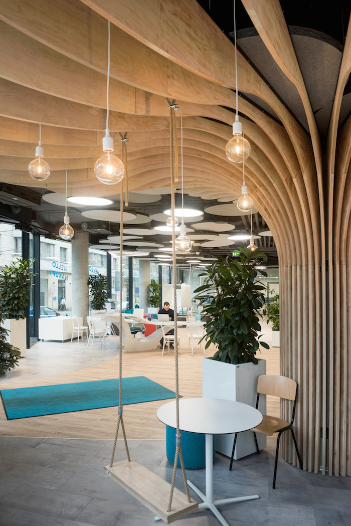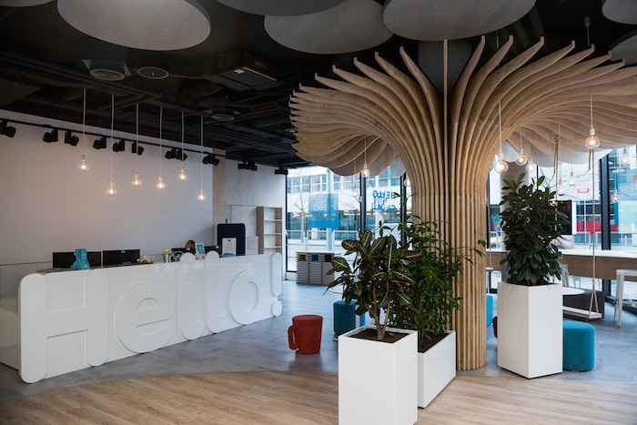 Hello bank! má také novou podobu poboček, pod níž je podepsána Erika Bohatá ze studia Capexus. Prostor je otevřen a transparentní, pracuje s modrou a bílou barvou. Součástí je i knihovna nebo například ping-pongový stůl.